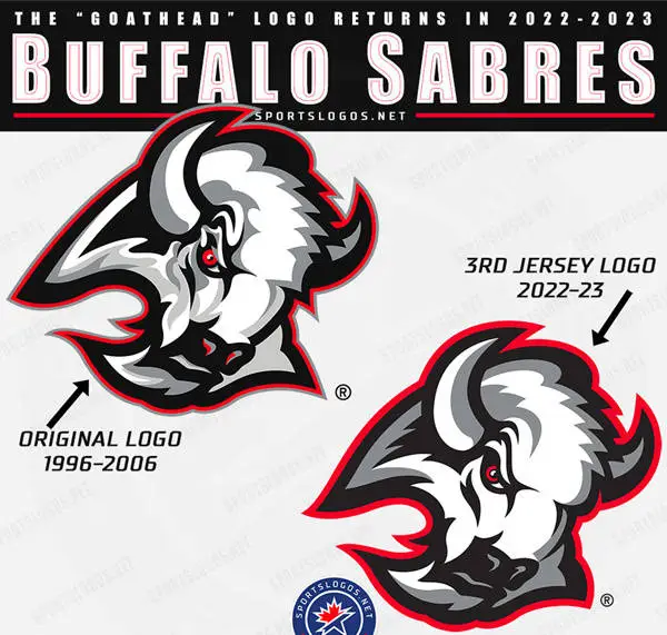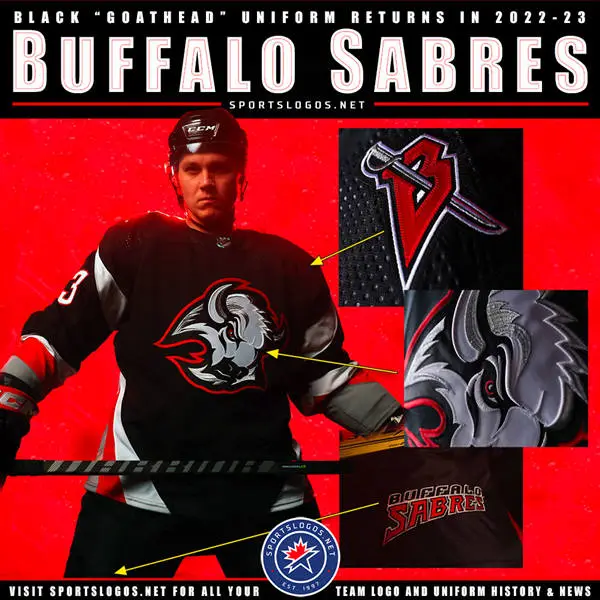 Buffalo Sabres are calling this sweater "reminiscent of the original," with some elements "updated and simplified." It brings back the late '90s Buffalo-head logo (called the "Goathead" by many) on a black jersey with the same white, red, and silver striping up the sides and sleeves.