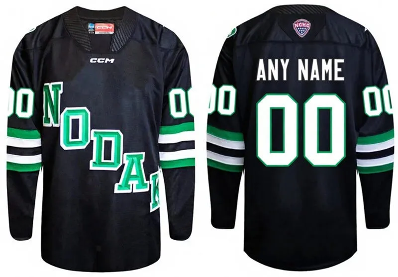 The green jersey and one white jersey feature "NORTH DAKOTA" on the front in an arched serif block front with a black drop shadow. These jerseys also have broad stripes on the waist and elbows - green on the white jersey and black on the green jersey - flanked with contrasting stripes. Both have the National Collegiate Hockey Conference logo on the right shoulder.