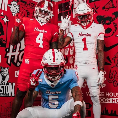 Another standout change is the update to the jersey wordmark. Houston Cougars has officially moved away from the rigid, all-caps serif font and replaced it with a sleek, flowing script "Houston"- a design element previously reserved for alternate helmets since 2022. It's a refined touch that adds personality and aligns perfectly with the city-pride aesthetic the Cougars have leaned into over the last few seasons.