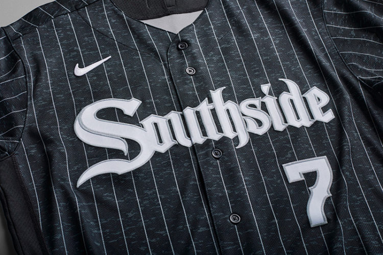 The Chicago White Sox City Connect Jersey features a textured pattern with inspiration from the Windy City's Greystone architectural style. The team's usual alternate logo of a single white sock on a black diamond is on the left sleeve, each sleeve is capped off with a white and grey stripe. Down at the jock tag, embroidered in white, is their road Chicago script — this will not be seen on-field as it will be tucked into their equally dark grey pants, which carries on the same pinstripe and Greystone textured pattern from the jersey.Player numbers on the front and back of the jerseys are white with grey trim and styled as if they were a natural extension of the font used for the usual SOX logo used by the team.