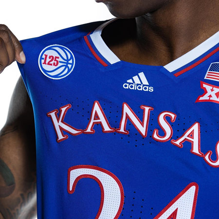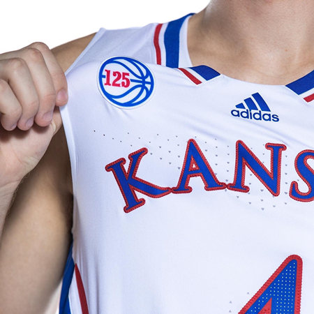 THE KANSAS JAYHAWKS HAVE INTRODUCED 2022-23 125TH YEAR UNIFORMS FOR THE UPCOMING SEASON. THE TEAM RELEASED A NEW WHITE AND BLUE SET OF THREADS. THE BIGGEST CHANGE ON THE NEW LOOK WILL BE A LARGE STRIPE ALL THE WAY DOWN THE SIDE OF THE JERSEY RUNNING INTO THE SHORTS. IN HONOR OF THE PROGRAMS 125TH YEAR, A SPECIAL PATCH WILL BE ON BOTH SETS OF THE UNIFORMS. THE PATCH IS LOCATED ON THE RIGHT SIDE AND FEATURES A BLUE BASKETBALL WITH THE NUMBER 125 SET WITHIN.