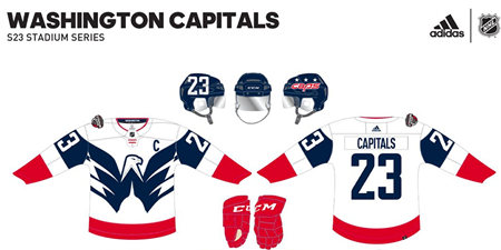 THE WASHINGTON CAPITALS HAVE REVEALED THEIR STADIUM SERIES LOOK FOR THEIR MATCHUP AGAINST THE CAROLINA HURRICANES. THE CAPS WENT WITH AN OVERSIZED ‘WEAGLE’ LOGO FRONT AND CENTER ON THE JERSEY. THE THREE BANDS OF COLOR IN THE SLEEVES ARE MEANT AS A NOD TO THE BANDED HEM ON THE CAPITALS' INAUGURAL JERSEYS. THE TWO HORIZONTAL LACES REPRESENT THE TWO RED BANDS ON THE D.C. FLAG, WITH DETALS ON THE INSIDE OF THE NECK FEATURES THE 'W' AND STARS CREST FROM THE CAPITALS' 2018 NHL STADIUM SERIES JERSEY.