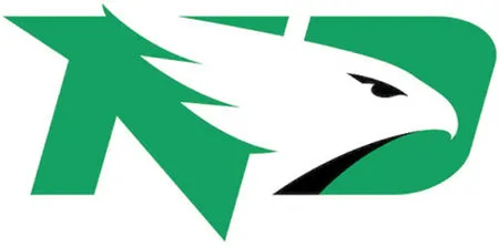 The green jersey and one white jersey feature "NORTH DAKOTA" on the front in an arched serif block front with a black drop shadow. These jerseys also have broad stripes on the waist and elbows - green on the white jersey and black on the green jersey - flanked with contrasting stripes. Both have the National Collegiate Hockey Conference logo on the right shoulder.